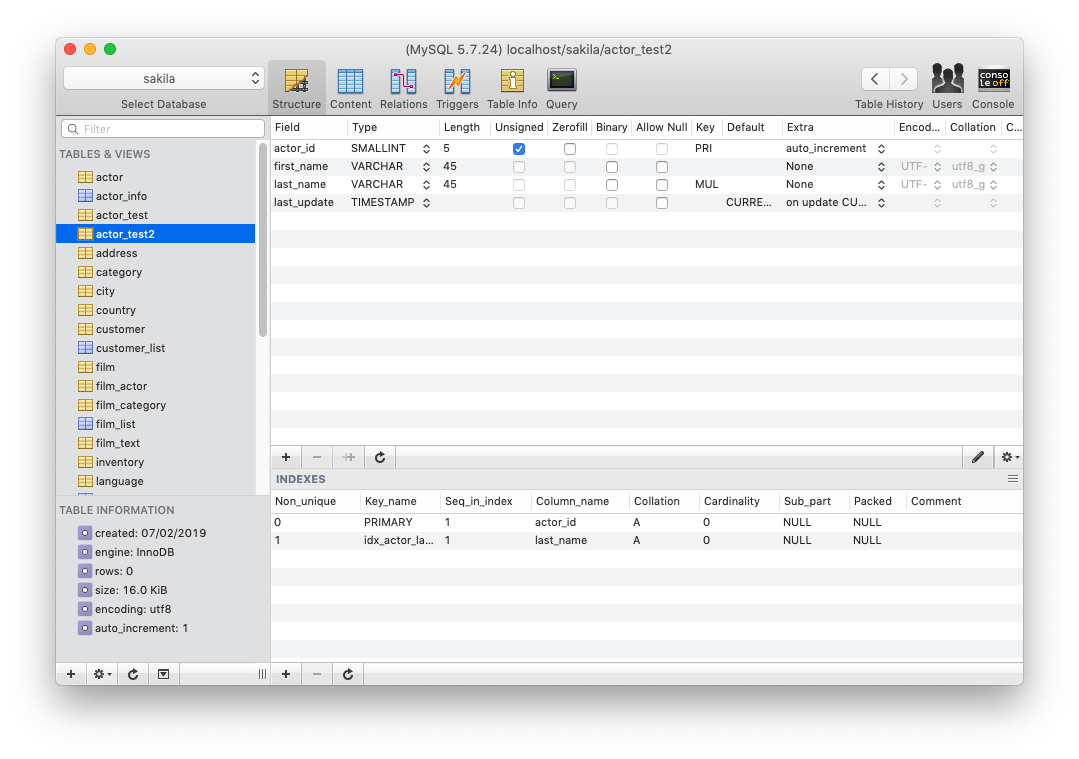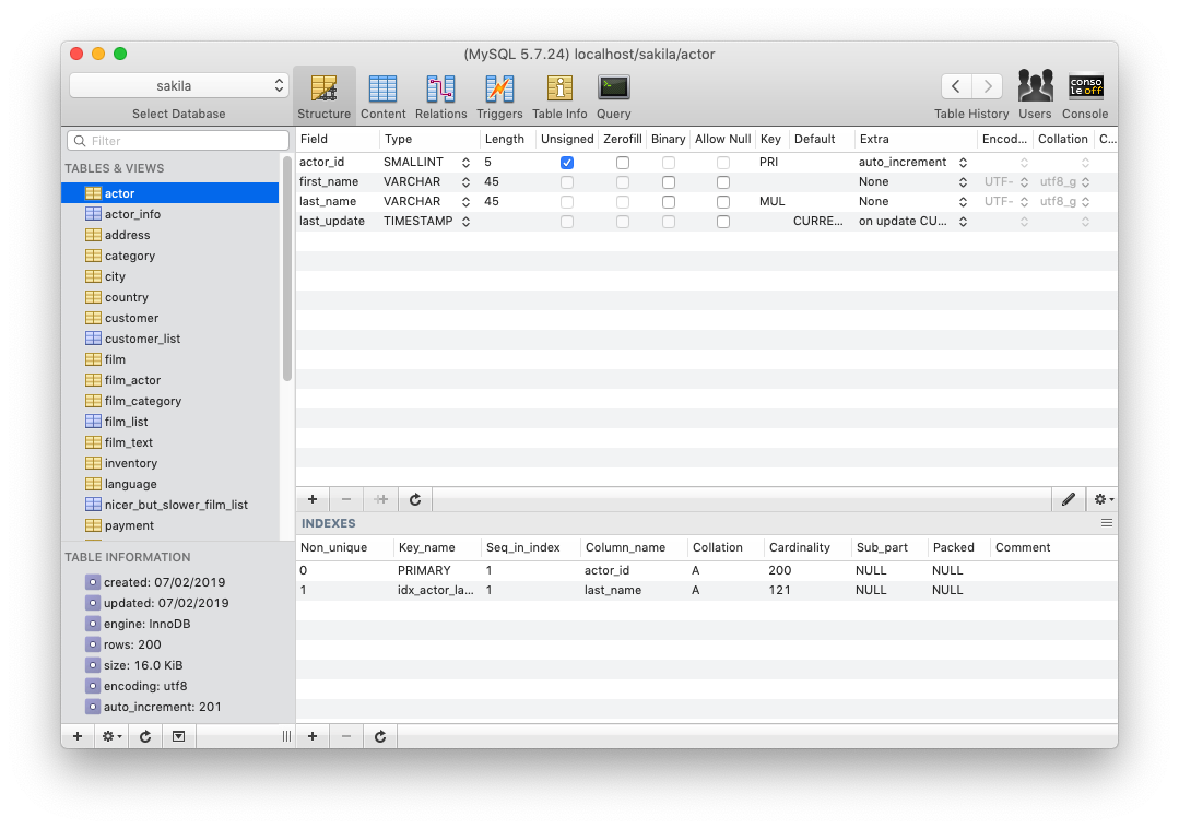 sakila 데이터베이스의 actor 테이블 구조를 간단하게 살펴보자. actor_id 컬럼이 테이블의 Primary Key이며, auto_increment 설정이 되어 있다. 그리고 컬럼은 actor_id , first_name, last_name, last_update 4개로 구성되어 있다.
