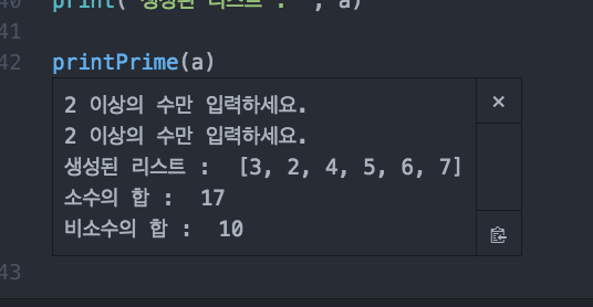 중복되는 데이터 없이 정수를 입력 받아서 리스트 a를 만든다. 리스트의 원소 중 비소수의 합과 소수의 합을 출력하는 함수를 작성한다. 만약 2보다 작은 수를 입력하면 안내 메시지를 출력한다.