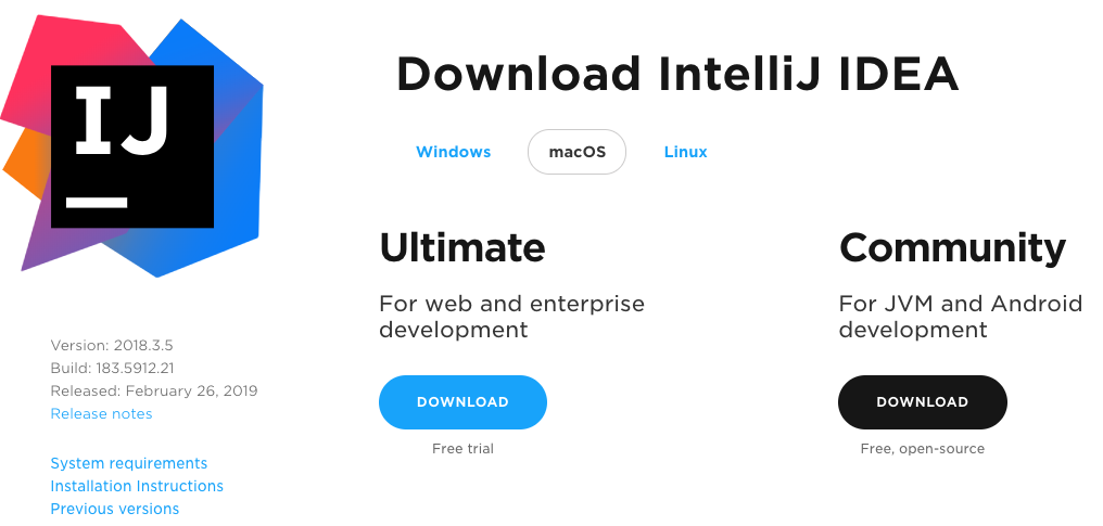 IntelliJ IDEA는 JetBrains 홈페이지에서 다운로드 받을 수 있습니다. 다운로드 페이지에 가면 Ultimate와 Community 버전을 확인 할 수 있습니다. Community 버전을 사용해도 무방하지만, 대학생이시라면 학교 메일 계정을 통해 Ultimate 버전을 사용하는 것을 추천드립니다.