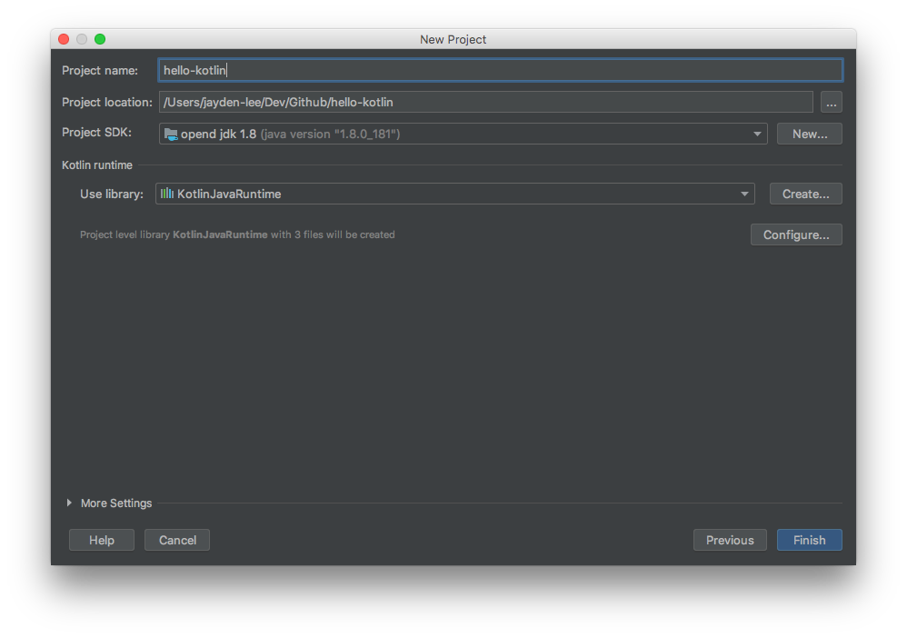 프로젝트 이름, 경로, SDK를 설정하고 나서 Finish 버튼을 클릭하고 나면, 첫 번째 Kotlin 프로젝트가 생성 됩니다 🎉