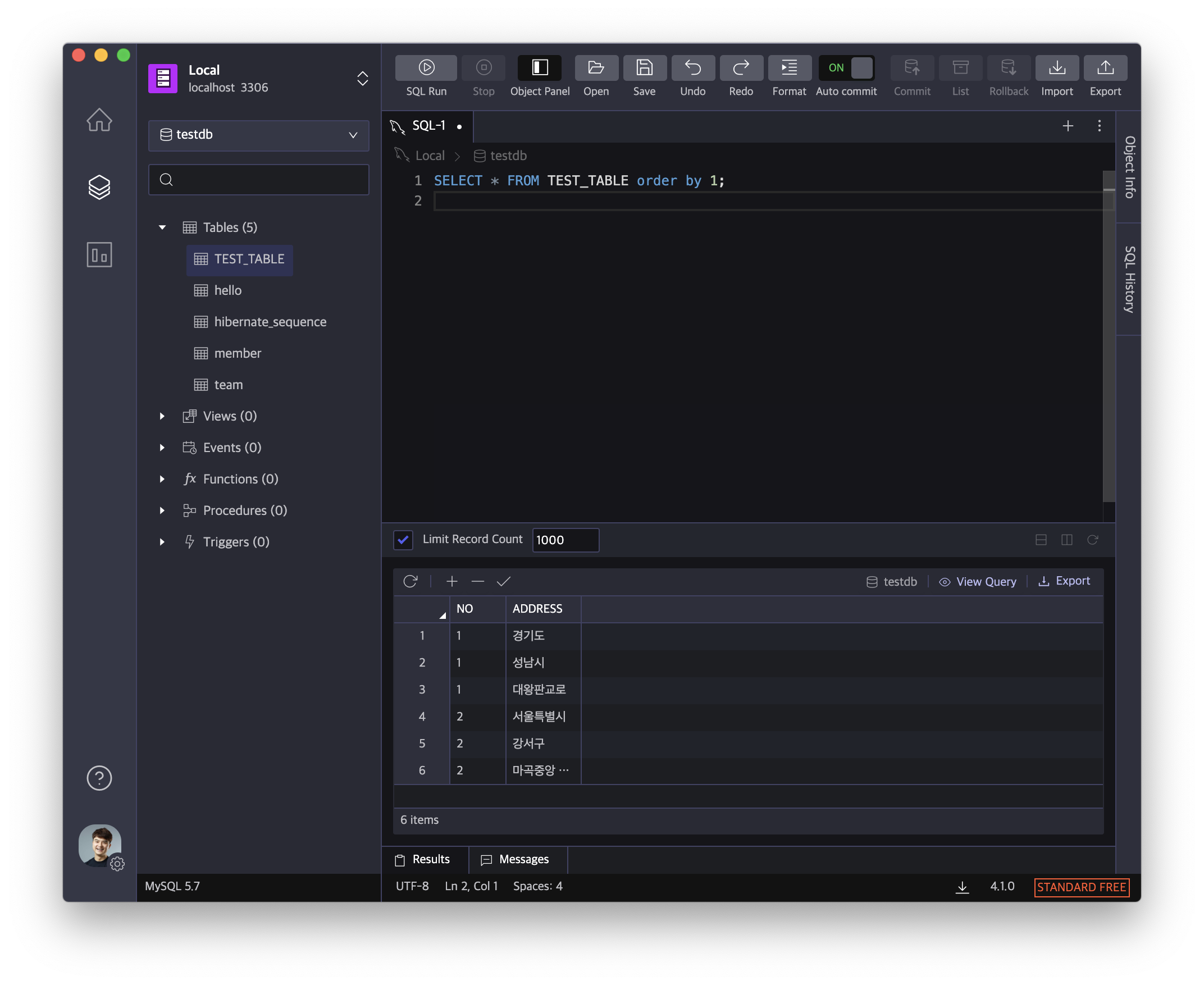 INSERT INTO TEST_TABLE values (1, '성남시');