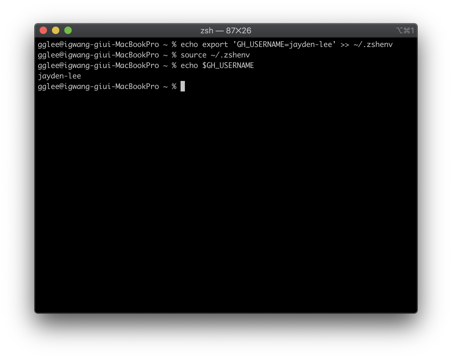 $ echo 'export GH_USERANME=jayden-lee' >> ~/.zshenv