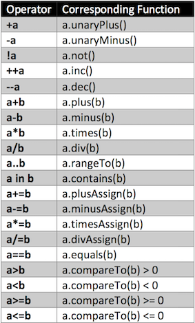 코틀린은 프로그래머가 직접 연산자를 만들어서 사용할 수 없고, 언어에서 미리 정해둔 연산자만 오버로딩 할 수 있다. 클래스에서 정의해야 하는 이름이 연산자 별로 정의 되어 있다.