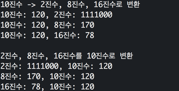 System.out.println("10진수 -> 2진수, 8진수, 16진수로 변환");