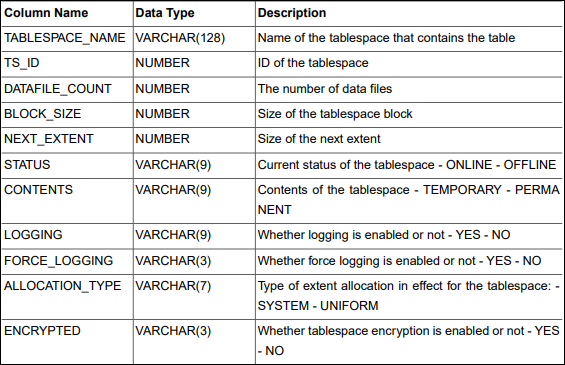 티베로 데이터베이스에서 테이블스페이스 정보를 조회하는 뷰 정보는 오라클과 유사하다. 그래서 오라클에서도 위와 같은 뷰를 통해 테이블스페이스 정보를 조회할 수 있다.