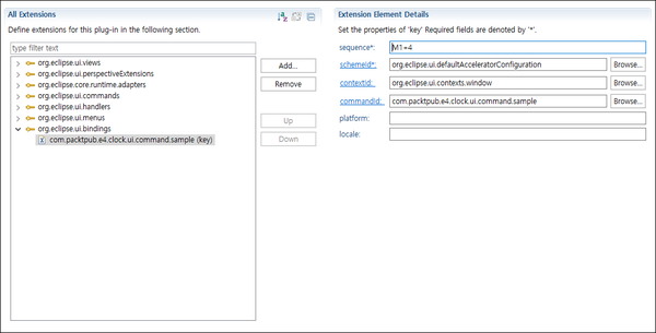 커맨드에 단축키를 연결할 때 바인딩(binding)을 사용한다. 바인딩은 "org.eclipse.ui.bindings" 확장점을 통해 설정하고, 커맨드 식별자와 키 조합을 연결한다.