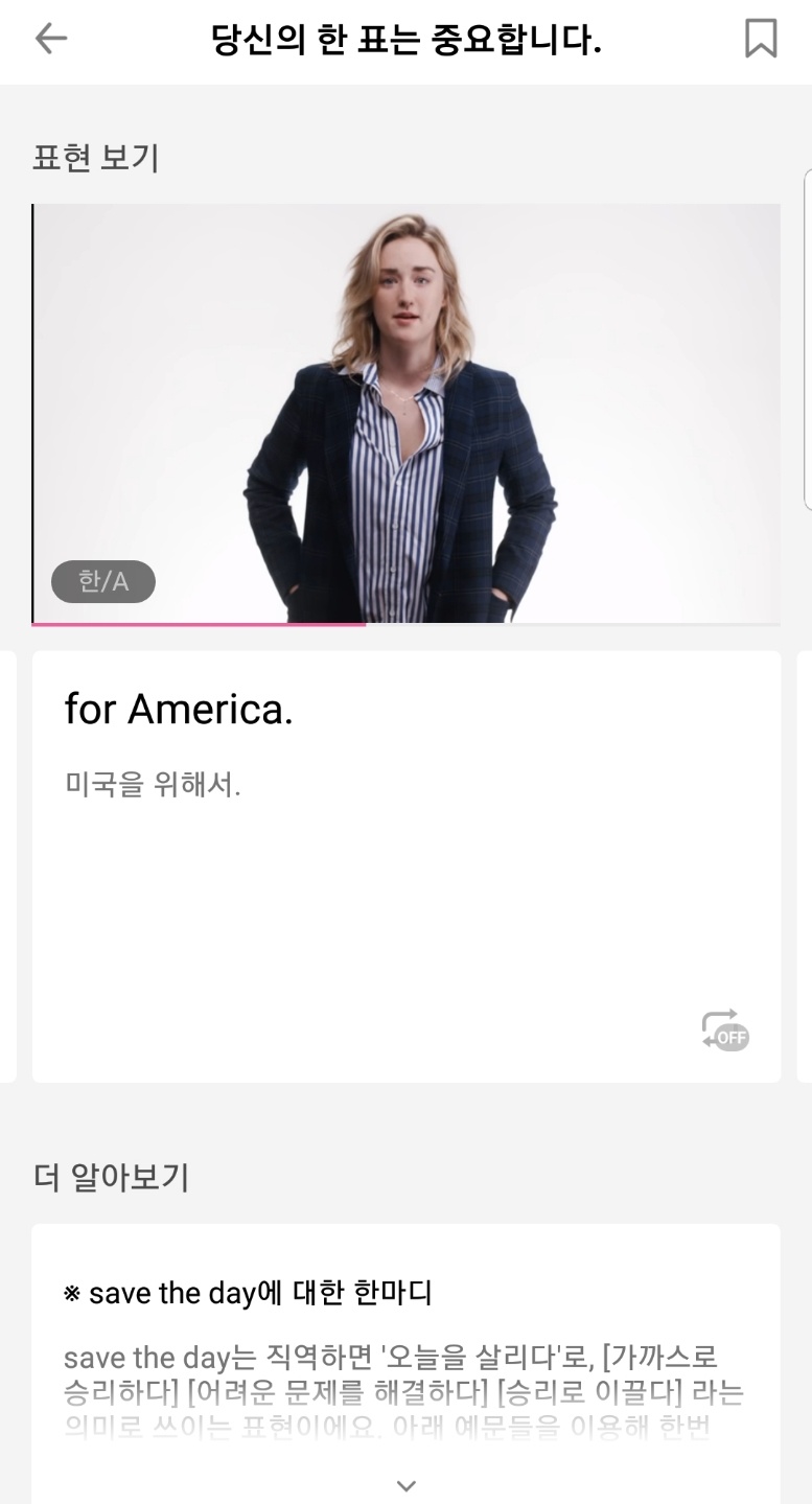 여러 영어 표현을 배울 수 있는 무료 애플리케이션입니다. 구글 앱스토어, 애플 앱스토어에서 다운로드 받을 수 있습니다. 제가 생각하는 이 앱의 가장 장점인 부분은 유투브에서 필요한 표현을 자르다보니 누구나 아는 유명인이 영상에서 나오기도 합니다.