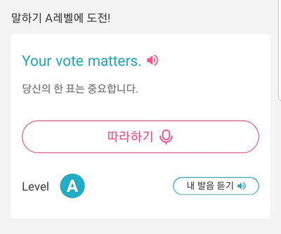 말하기 A레벨에 도전에서는 영상에서 학습한 표현 중 핵심 문장을 직접 따라하고 평가 받을 수 있습니다.