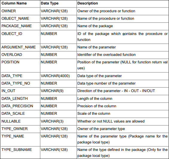 ALL_ARGUMENTS는 함수 또는 프로시저의 모든 파라미터 정보를 보여주는 뷰이다.