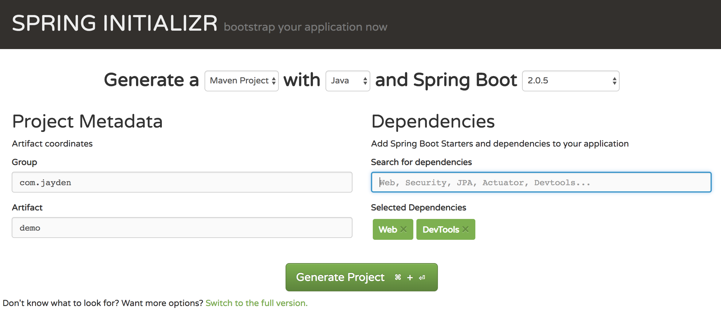 Spring Boot 프로젝트는 https://start.spring.io/ 사이트에서 쉽게 생성할 수 있다. Generate Project 버튼을 클릭하면 프로젝트를 압축 파일로 다운로드 받을 수 있다.