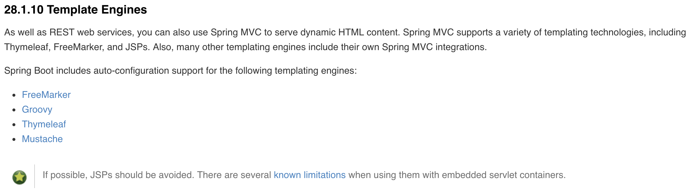 Spring Boot에서는 공식 문서에도 나와 있듯이 JSP를 사용하는 것을 권하지 않고 다른 템플릿 엔진을 추천하고 있다.