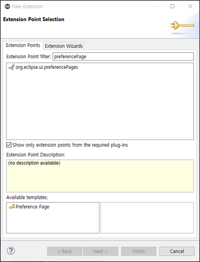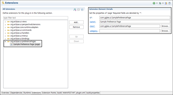 - plugin.xml 파일에 가서 "org.eclipse.ui.preferencePages" 확장점을 이용해서 새로운 환경설정 페이지를 선언한다.