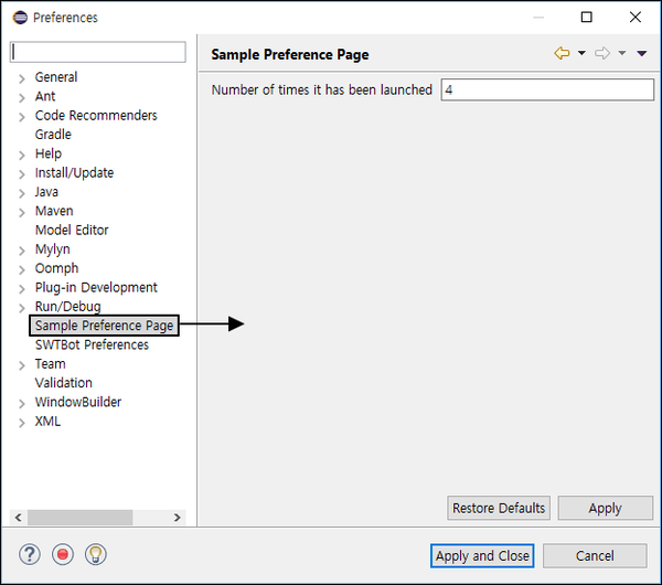 - 프로그램을 실행해서 환경설정(Preferences)으로 이동해서 "Sample Preference Page"를 클릭한다.