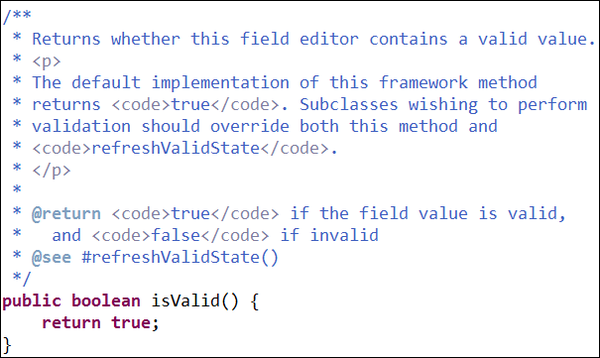 이럴 경우에는 사용자에게 경고 또는 오류메시지를 표시해야 한다. 이때 사용하는 것이 유효성 검사이다. 유효성 검사는 FieldEditor 클래스의 isValid() 메서드를 오버라이드해서 로직에 맞게 구현하면 된다.