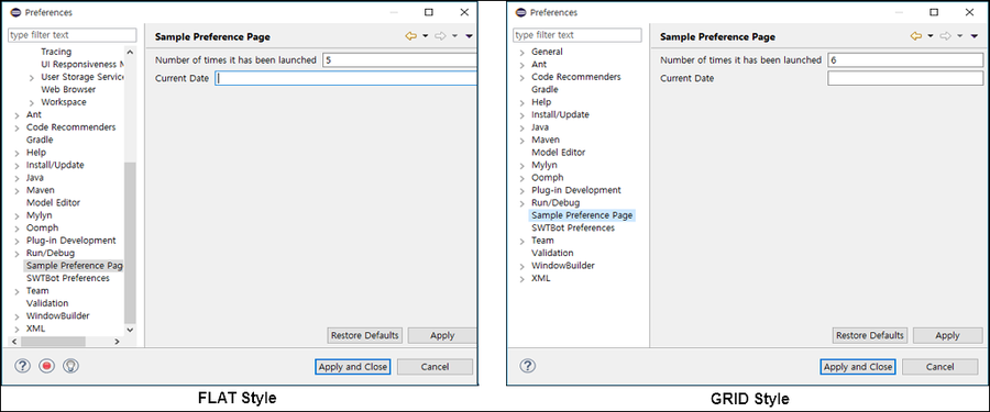 환경설정 필드 편집기는 FLAT 스타일의 렌더러를 사용한다. FLAT 스타일은 수직 RowLayout와 같이 필드를 배치한다. 일반적으로 많이 사용하는 그리드 스타일로 변경하려면, 환경설정 페이지 클래스의 생성자 위치에 GRID 스타일의 렌더러를 지정한다. GRID 스타일은 레이블과 필드의 길이를 계산해서 각 요소를 적절히 분리하고 배치한다.
